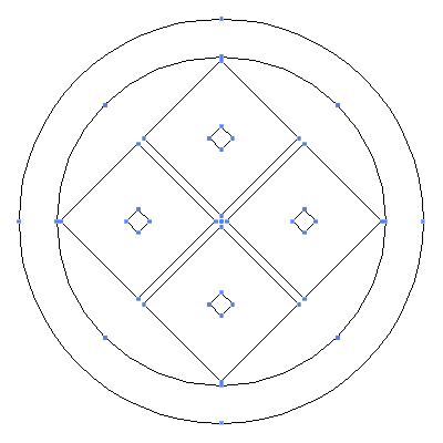 本記事テーマの『丸に隅立て四つ目(結)』は、「4個の目」を「角で立てた」図案を「丸で囲った」ものである事からこの名称となっているというわけです。※目結紋の個別名称の場合、目結の「結」の部分は省略して記載・呼称する傾向にあるようです。