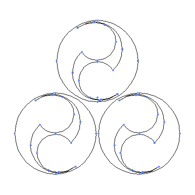 家紋・三つ盛り左二つ巴は、「オタマジャクシ」や「勾玉」に似た特徴的な形状を持つ図形を用いて構成される家紋の一群である『巴紋』の一種です。